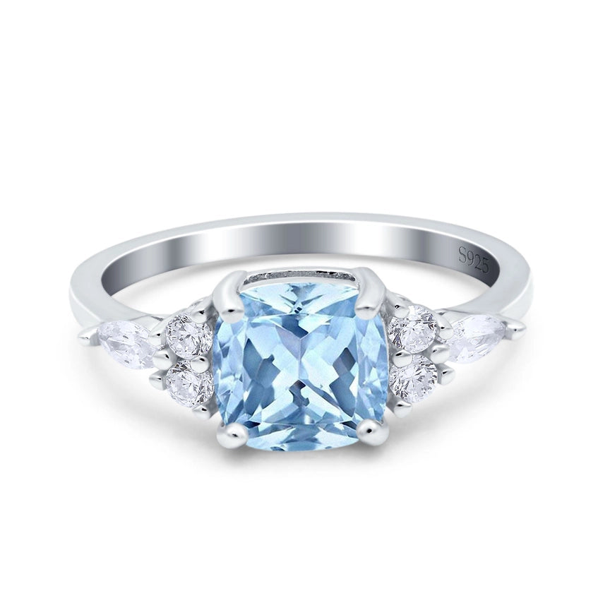 Embrace Art Deco elegance with this striking ring, featuring a brilliant Cushion Cut simulated Aquamarine as its centrepiece. The polished Sterling Silver band is illuminated by dazzling clear Cubic Zirconia clusters, creating a beautiful and opulent statement piece.