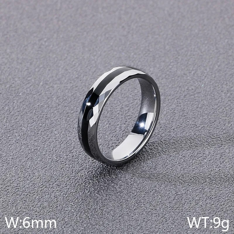 It features a bold, high-contrast black central inlay surrounded by a highly polished, geometrically faceted edge. This unique texture catches the light for maximum impact. Available in both 6mm (slimmer) and 8mm (bolder) widths, it is durable, heavy-wearing, and perfect for daily use. This ring makes an incredible, long-lasting gift for him.