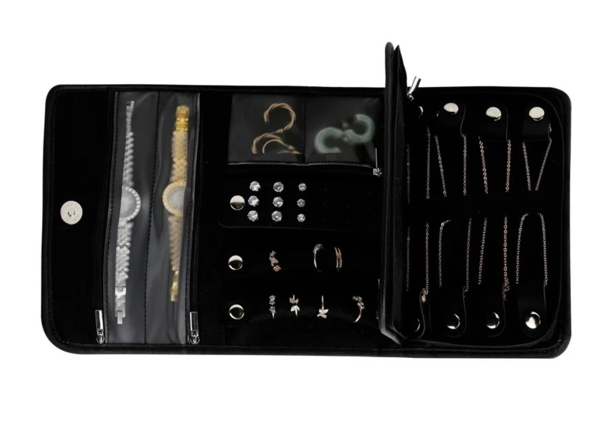 For the discerning traveller, this sleek black jewellery bag case is the ultimate accessory for keeping your treasured items secure and meticulously organised while away from home. Its velvety interior and intelligent layout ensure every piece—from watches and delicate necklaces to earrings and rings—has its own protected spot, eliminating tangles and scratches.