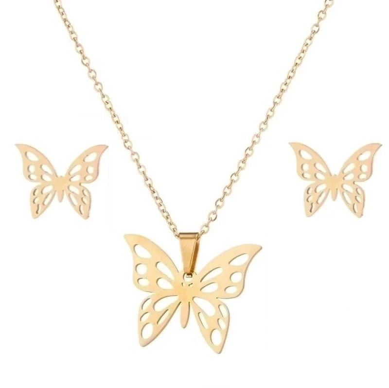 Elevate your look with this delightful Gold Plated Stainless Steel Butterfly Necklace & Earring Set. Featuring an intricately cut-out butterfly pendant and matching stud earrings, this durable and hypoallergenic duo brings a touch of whimsical charm to any outfit.