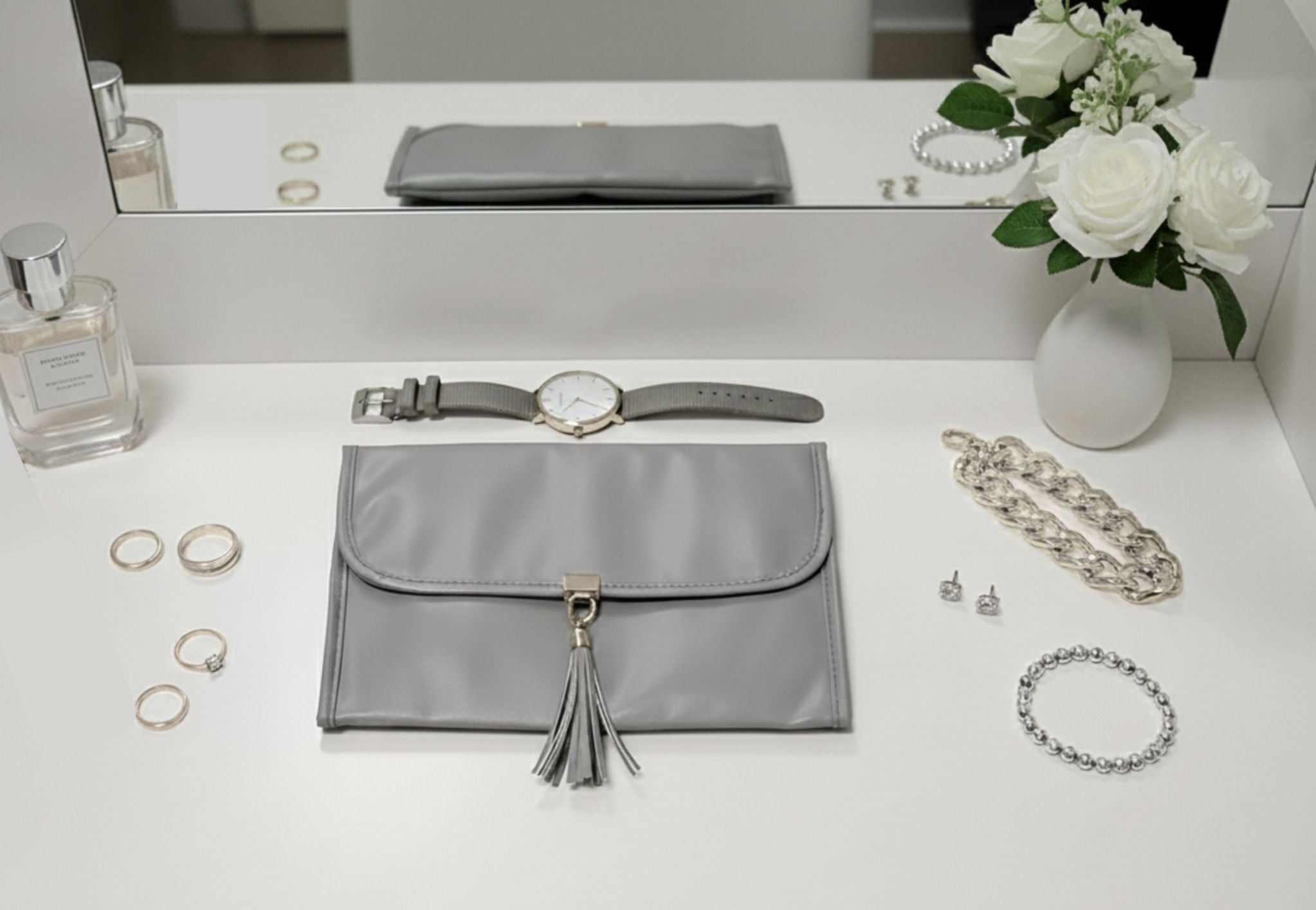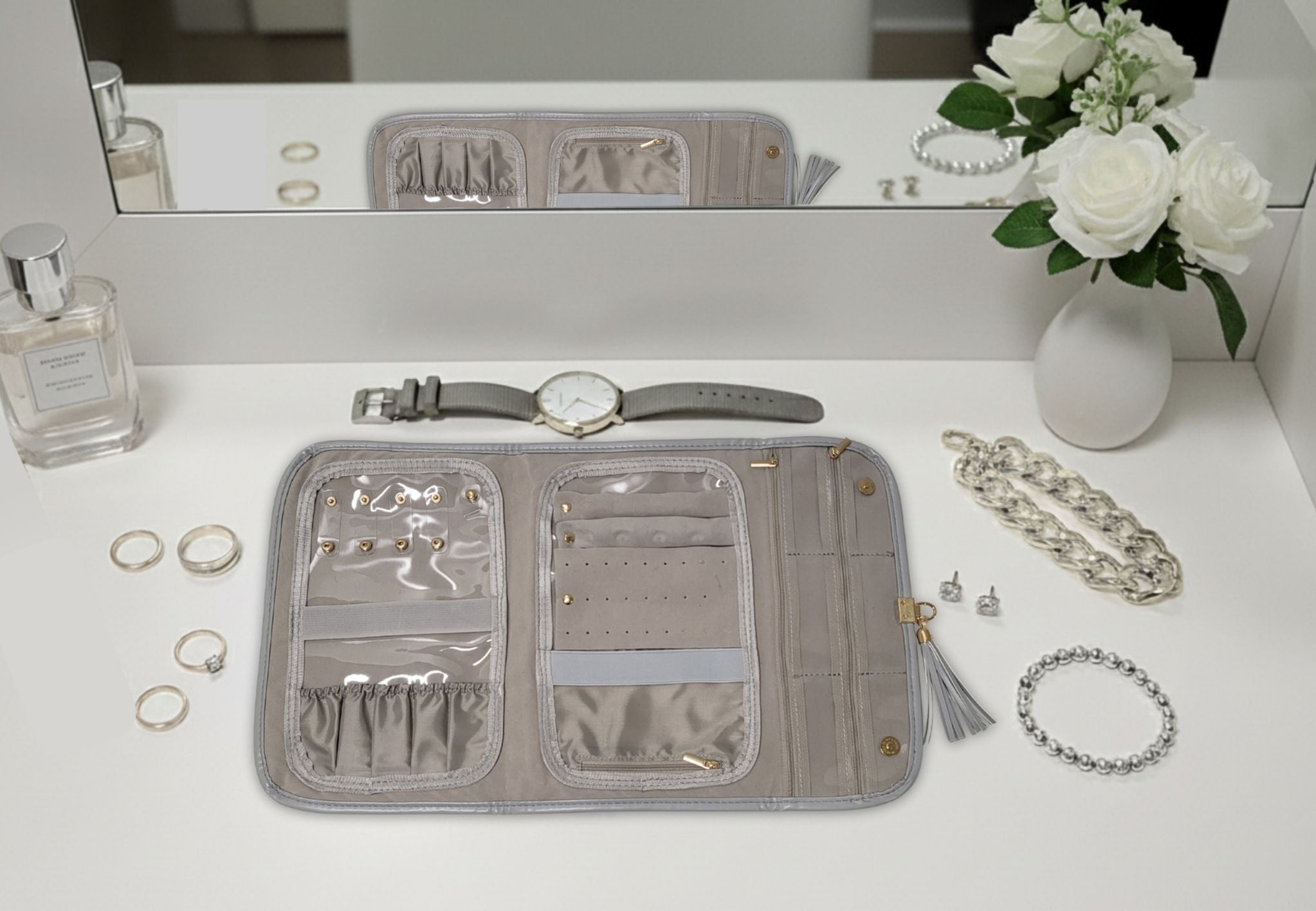 Never leave your precious pieces behind! This elegant grey travel jewellery case is the perfect companion for short trips or extended holidays. Designed to hold your necklaces, rings, earrings, and bracelets securely, this lightweight and flexible organiser ensures your jewellery stays tangle-free and protected while you're on the move.