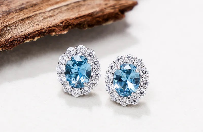 Embrace soft elegance with these Sterling Silver stud earrings, featuring a lovely central artificial Simulated Light Blue Topaz gemstone. The central stone is framed by a delicate halo of sparkling white Zirconia, making this a classic and versatile piece.
