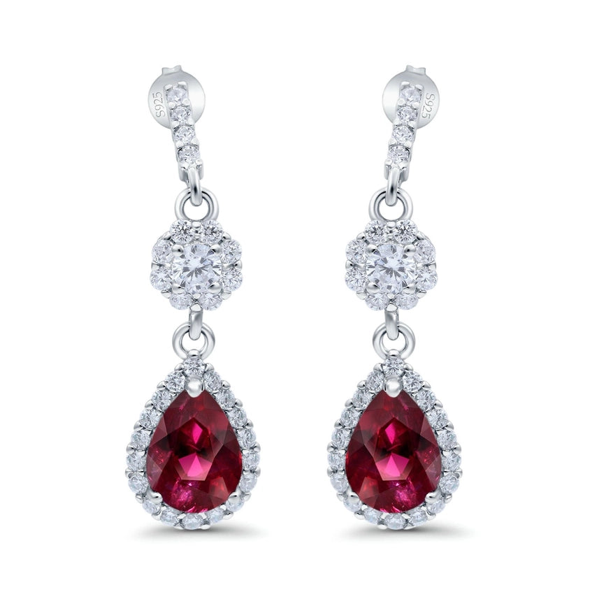Elegant Sterling Silver drop earrings feature a dazzling halo design, perfect for special occasions or adding glamour to your evening wear. The brilliant upper cluster drops down to a striking teardrop-cut simulated ruby gemstone, surrounded by a delicate halo of sparkling Cubic Zirconia stones.