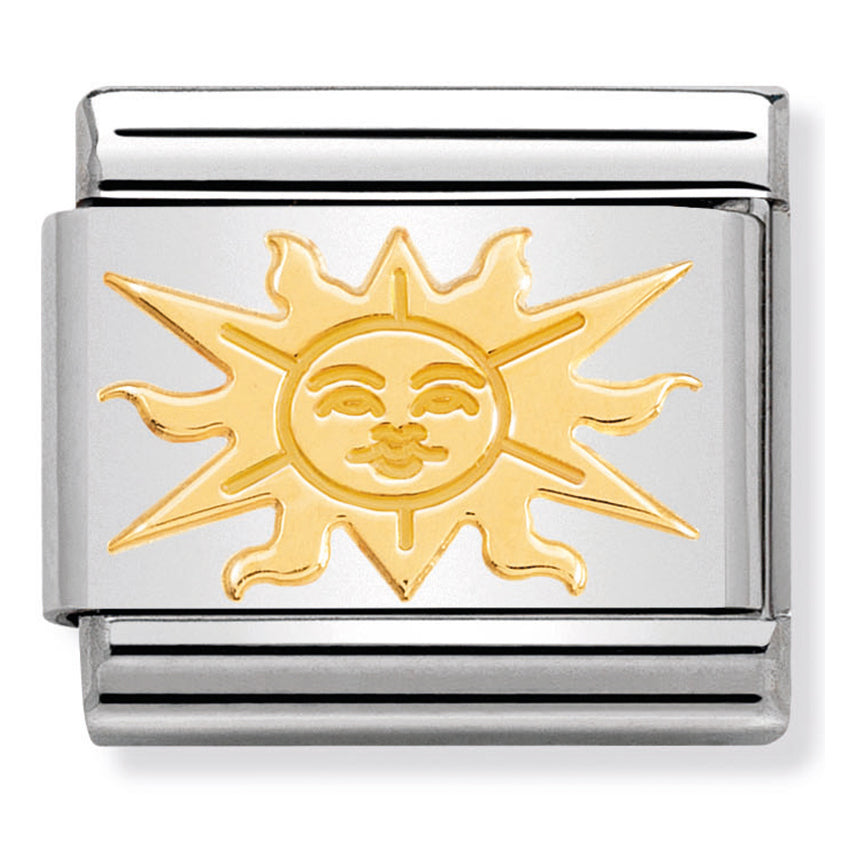 Original Composable Link for Nomination's Composable Classic Bracelet with Relief Sun symbol in 18K gold on stainless steel.