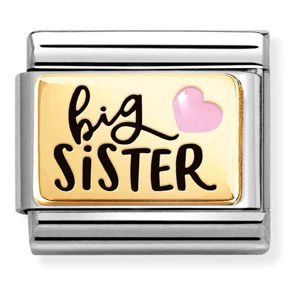 Original Composable Link for Nomination's Composable Classic Bracelet with Big Sister with Pink Heart symbol in 18K gold and enamel on stainless steel.