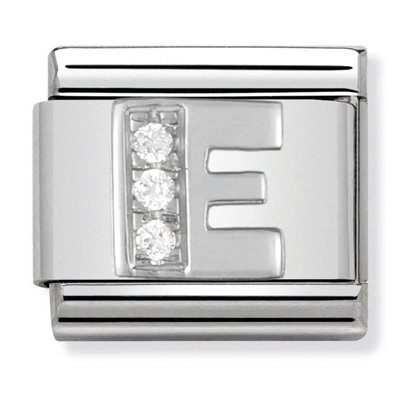 Nomination Original Classic Link for Composable Bracelet with Letter E symbol with Cubic Zirconia in sterling silver on stainless steel.