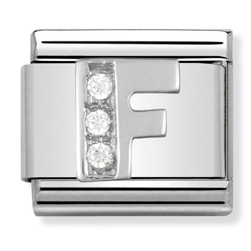 Nomination Original Classic Link for Composable Bracelet with Letter F symbol with Cubic Zirconia in sterling silver on stainless steel.