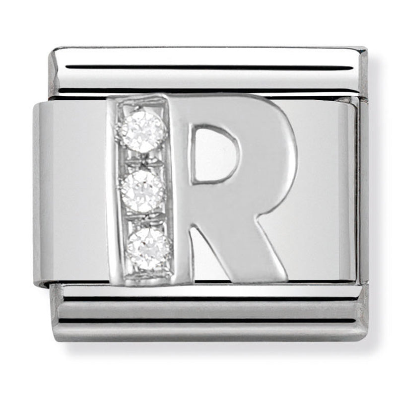 Nomination Original Classic Link for Composable Bracelet with Letter R symbol with Cubic Zirconia in sterling silver on stainless steel.