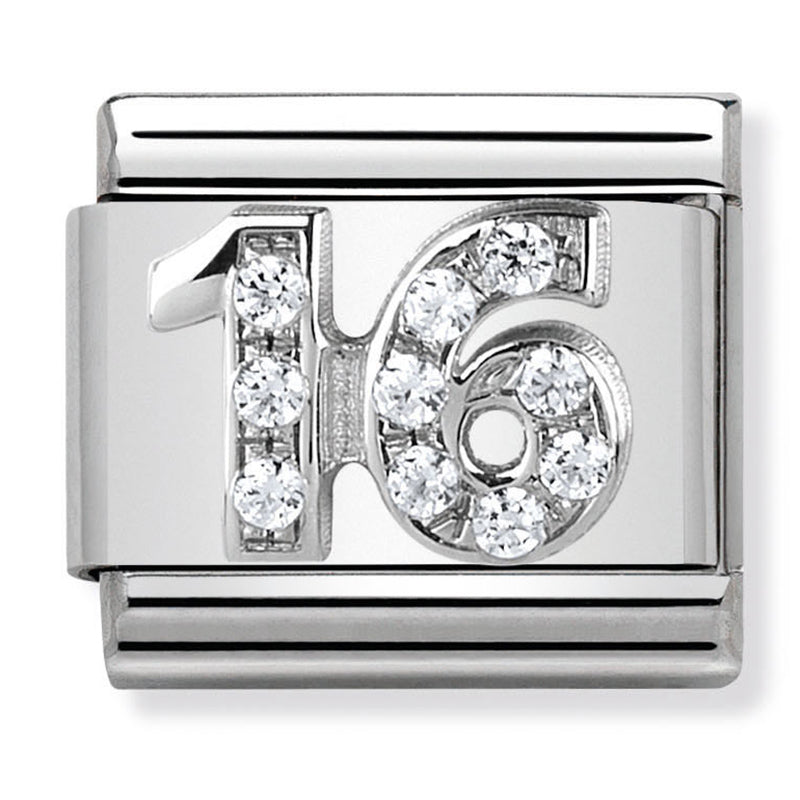 Nomination Original Classic Link for Composable Bracelet with Number 16 symbol with White Cubic Zirconia in sterling silver on stainless steel.