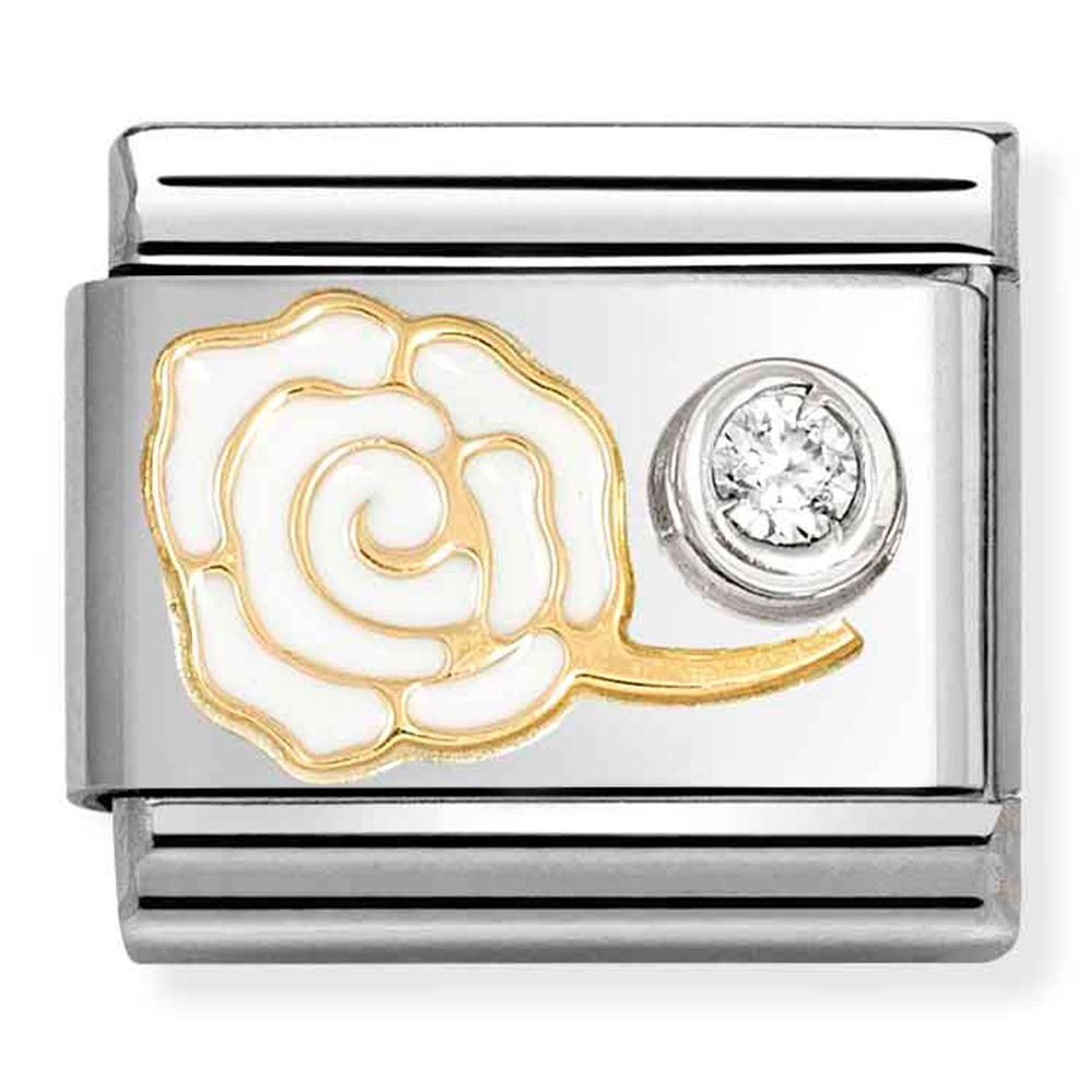 Original Composable Link for Nomination’s Composable Classic Bracelet with White Rose symbol in 18K gold, white enamel with white Cubic Zirconia set in silver on stainless steel.