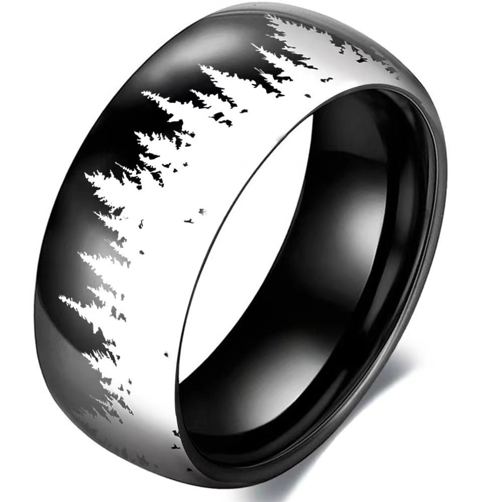 The ultimate ring for the modern man who loves the outdoors. This 8mm Black Titanium band features a striking Silver Forest silhouette.