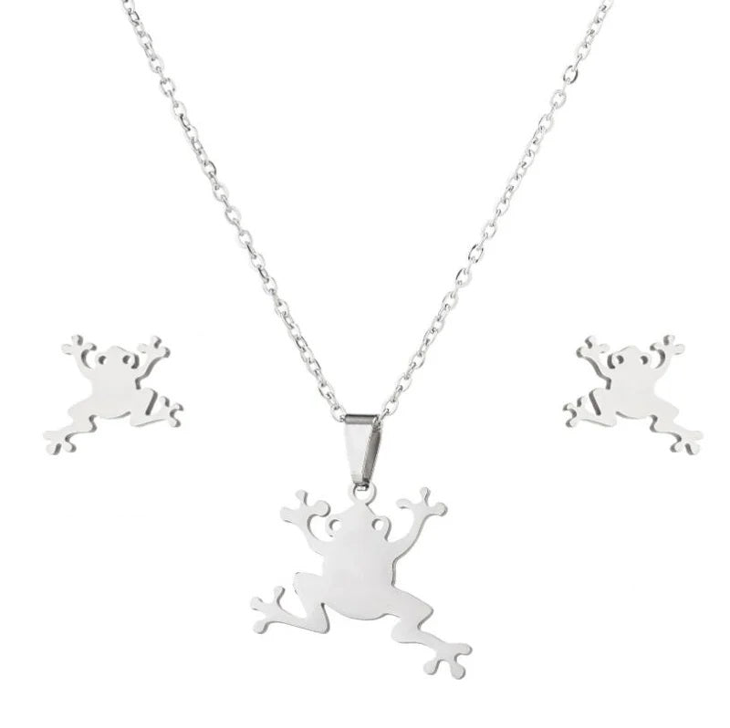 Leap into style with this unique Stainless Steel Frog Necklace & Earring Set. This charming duo features a delightful frog silhouette pendant on a delicate chain, perfectly complemented by matching stud earrings, adding a playful and distinctive touch to your everyday look.