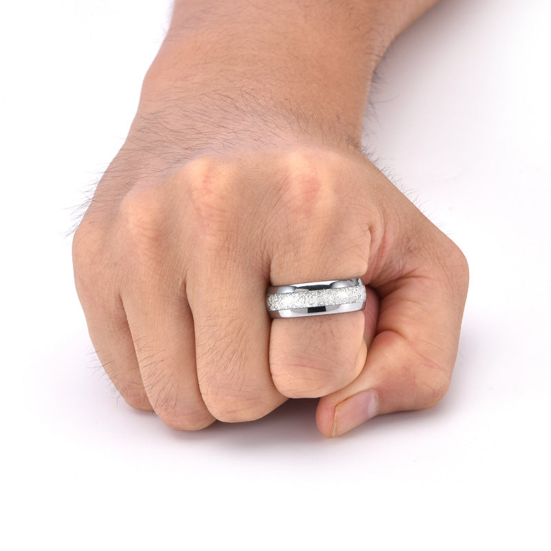 The centre features a highly textured inlay of fine, sparkling silver fragments that shimmer with a modern, 'retro geometric' appeal. Highly polished edges complete the look. Available in three widths - 4mm (slim fit), 6mm (classic), and 8mm (statement) - this ring is perfect for matching sets, unique thumb rings, or everyday heavy wear.